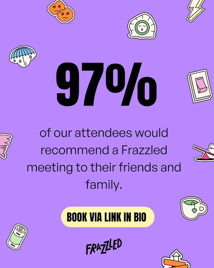 Frazzled runs online and offline facilitated support sessions for anyone struggling with the pressures of modern life. Every day of the year, free of charge offering a consistent, safe and non judgemental space where people can feel seen, heard, and less alone, and find relief through connection.